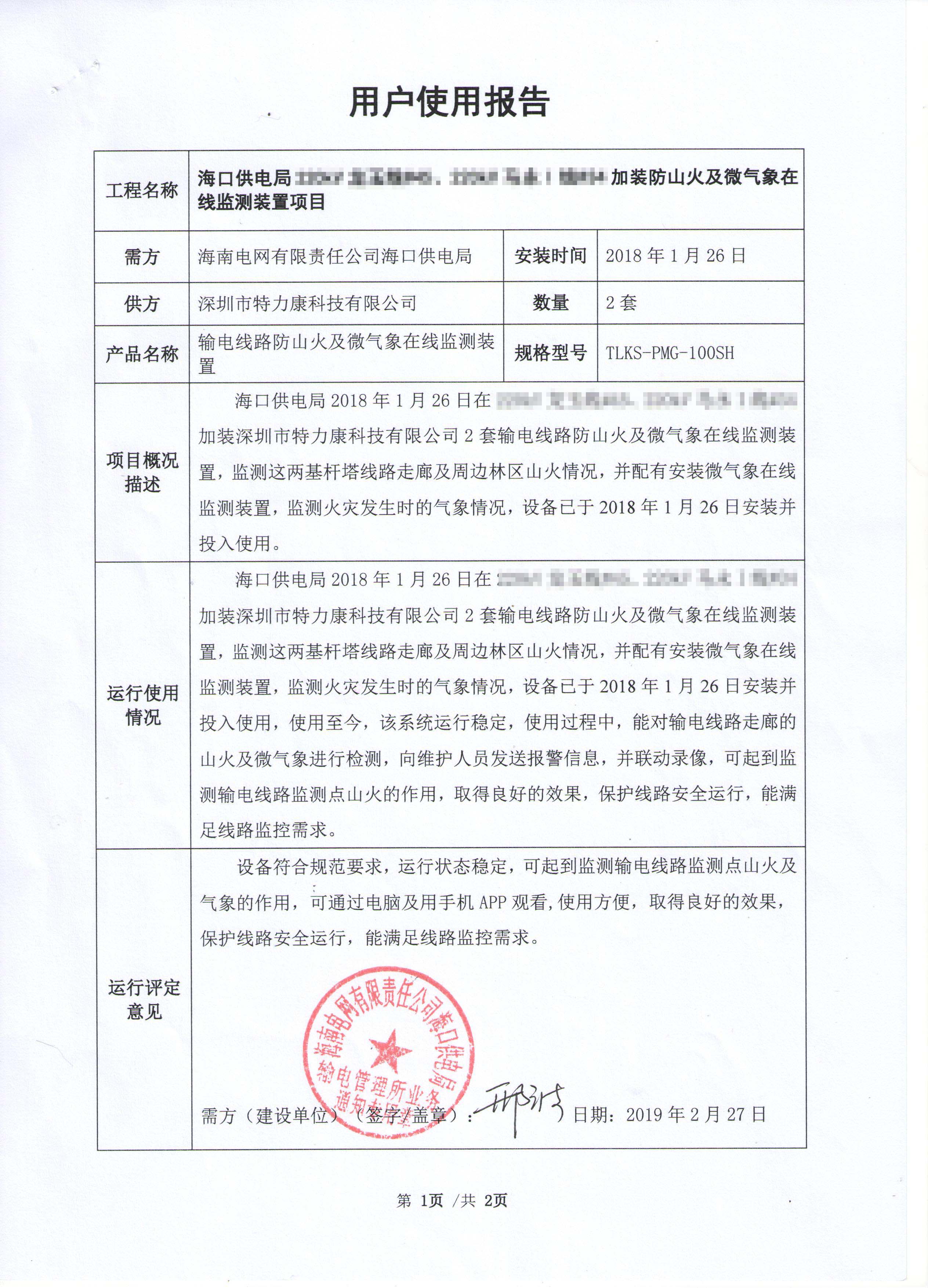 2018年1月26日??诠╇妴挝辉谳爡^(qū)管理線(xiàn)路安裝我司(深圳市特力康科技有限公司)輸電線(xiàn)路防外破裝置,該裝置應(yīng)局方要求加裝了微氣象監(jiān)測(cè)裝置及防山火裝置,監(jiān)測(cè)塔桿線(xiàn)路走廊以及周邊森林區(qū)域山火情況。
