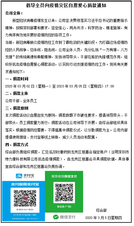 在公司層領(lǐng)導(dǎo)的帶領(lǐng)下,特力康人員紛紛解囊,小到幾十上百,大到數(shù)千,錢不分多寡,截止3月6日,結(jié)合特力康公積金捐助,共計捐款十萬元整。這都是特力康人在力所能及范圍內(nèi)對抗擊疫情的默默支持,是對有困難群眾的守望相助。充分發(fā)揚(yáng)團(tuán)結(jié)互助精神,攜手并肩,眾志成城,凝聚起抗擊疫情的堅定信心和強(qiáng)大力量,用另一種方式陪伴一線抗疫醫(yī)務(wù)人員和疫情患者一起戰(zhàn)勝病魔。