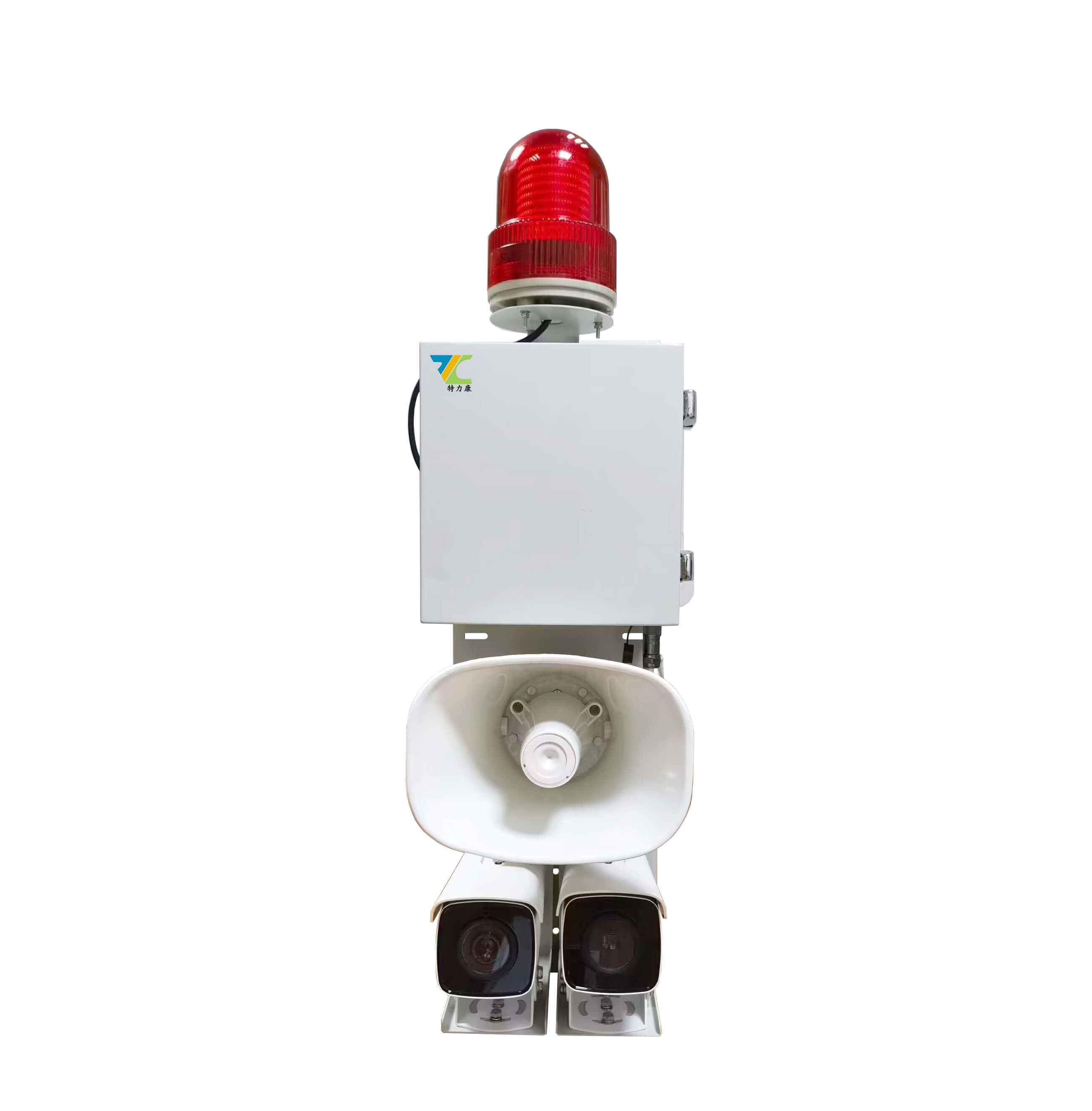 鐳射限高防外破預(yù)警裝置安裝時(shí),使鐳射光線在安全高度與導(dǎo)線平行,在光照條件不足時(shí),將發(fā)射鐳射光,以實(shí)現(xiàn)對(duì)線下超高機(jī)械施工、線路通道、無關(guān)人員靠近線路等起到實(shí)時(shí)警示的作用。另可通過激光雷達(dá)探測(cè)實(shí)時(shí)分析越線情況,并在探測(cè)到越線隱患時(shí),立即發(fā)出語音告警及爆閃警示,以避免外破隱患的發(fā)生。