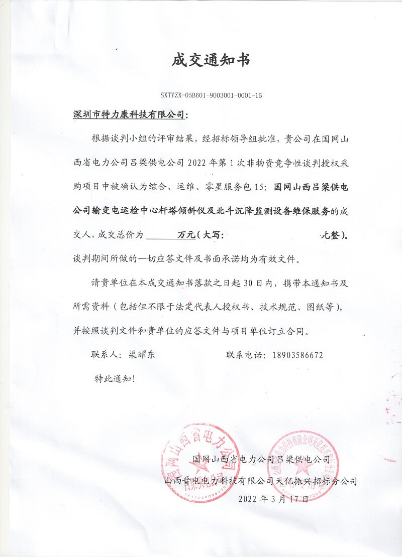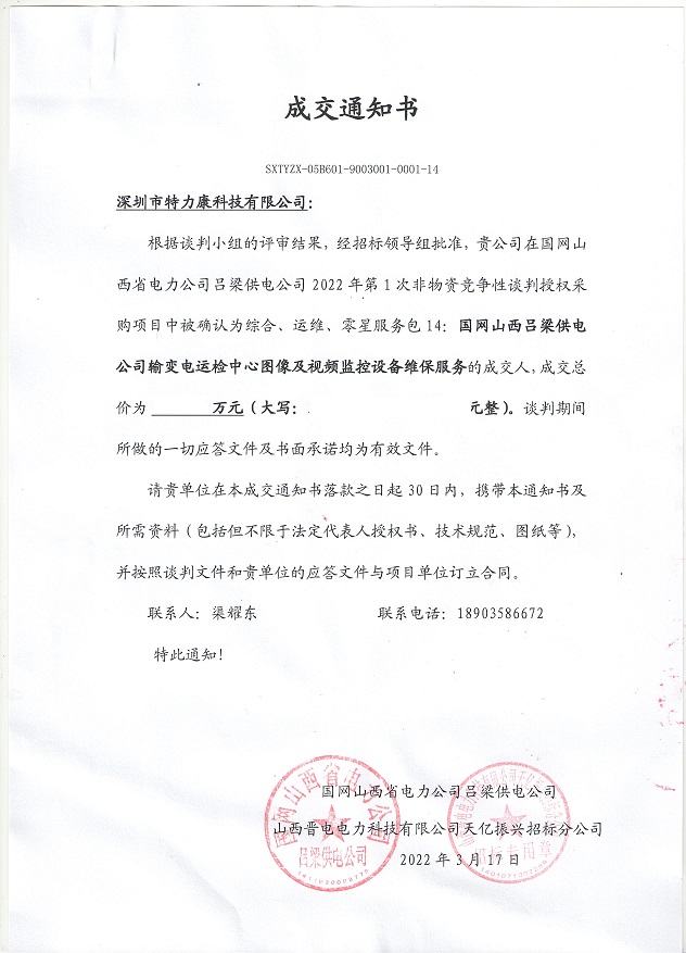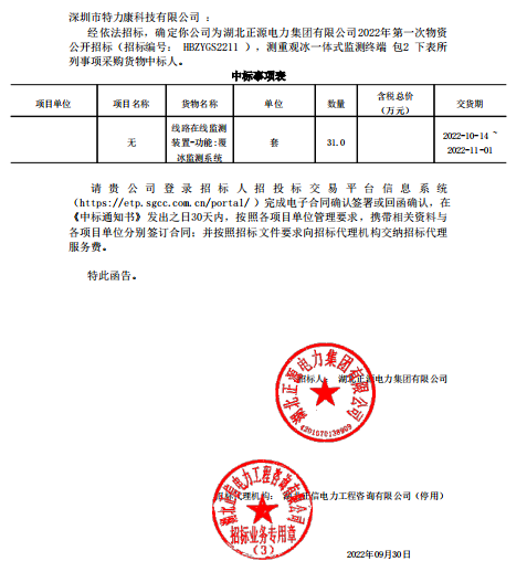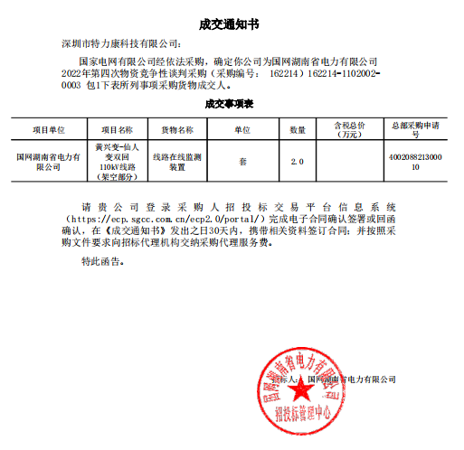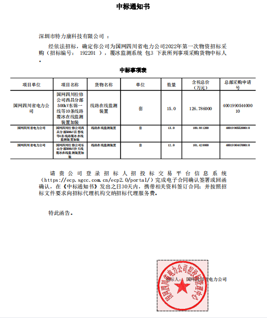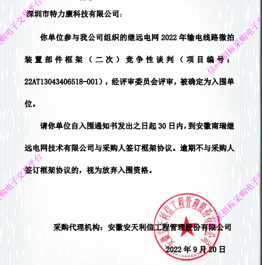 特力康中標(biāo)國(guó)網(wǎng)黑龍江送變電工程公司的2024年度第18次物資類競(jìng)爭(zhēng)性談判采購(gòu)項(xiàng)目——慶陽(yáng)驅(qū)鳥器物資框 特力康中標(biāo)國(guó)網(wǎng)甘肅省電力公司省管產(chǎn)業(yè)單位2024年第五次物資競(jìng)爭(zhēng)性談判授權(quán)采購(gòu)項(xiàng)目 中標(biāo)喜訊:深圳市特力康科技有限公司成功入圍許繼集團(tuán)綜合能源公司輸電線路視頻在線監(jiān)測(cè)裝置模塊集采項(xiàng)目 中標(biāo)喜訊:特力康成功中標(biāo)國(guó)網(wǎng)重慶市電力公司渝中一片區(qū)項(xiàng)目 特力康成功中標(biāo)國(guó)網(wǎng)天津市電力公司2024年第二次?物?資招標(biāo)項(xiàng)目 特力康中標(biāo)國(guó)網(wǎng)安徽省電力有限公司蕪湖供電公司2024年3月非物質(zhì)采購(gòu)項(xiàng)目 破解巡檢難題:貴州電力用特力康 AI 微拍裝置,精準(zhǔn)捕捉線路隱性隱患 精準(zhǔn)捕捉 “微氣象”:浙江電力用特力康預(yù)警系統(tǒng)筑牢電網(wǎng)氣候防線 守護(hù) “電力咽喉”:湖南電力投用百套特力康三跨 4G 監(jiān)控球,筑牢安全防線 貴州電力裝特力康電網(wǎng)架空線路覆冰監(jiān)測(cè)系統(tǒng),精準(zhǔn)防冰保電網(wǎng)過(guò)冬? 百套落地山西電網(wǎng)!特力康輕量化輸電架空線路監(jiān)拍裝置,筑牢輸電安全網(wǎng) 破解采空區(qū)隱患:山西電力裝特力康通用型監(jiān)測(cè)裝置,守鐵塔穩(wěn)運(yùn)行 四川電力用特力康架空輸電線路山火監(jiān)測(cè)裝置,筑牢林區(qū)輸電 “防火墻”? 寧夏配電線路安裝了我司防外破電子化智能警示牌