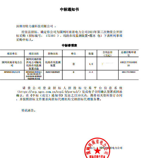 特力康中標(biāo)國網(wǎng)黑龍江送變電工程公司的2024年度第18次物資類競爭性談判采購項目——慶陽驅(qū)鳥器物資框 特力康中標(biāo)國網(wǎng)甘肅省電力公司省管產(chǎn)業(yè)單位2024年第五次物資競爭性談判授權(quán)采購項目 中標(biāo)喜訊:深圳市特力康科技有限公司成功入圍許繼集團(tuán)綜合能源公司輸電線路視頻在線監(jiān)測裝置模塊集采項目 中標(biāo)喜訊:特力康成功中標(biāo)國網(wǎng)重慶市電力公司渝中一片區(qū)項目 特力康成功中標(biāo)國網(wǎng)天津市電力公司2024年第二次?物?資招標(biāo)項目 特力康中標(biāo)國網(wǎng)安徽省電力有限公司蕪湖供電公司2024年3月非物質(zhì)采購項目 破解巡檢難題:貴州電力用特力康 AI 微拍裝置,精準(zhǔn)捕捉線路隱性隱患 精準(zhǔn)捕捉 “微氣象”:浙江電力用特力康預(yù)警系統(tǒng)筑牢電網(wǎng)氣候防線 守護(hù) “電力咽喉”:湖南電力投用百套特力康三跨 4G 監(jiān)控球,筑牢安全防線 貴州電力裝特力康電網(wǎng)架空線路覆冰監(jiān)測系統(tǒng),精準(zhǔn)防冰保電網(wǎng)過冬? 百套落地山西電網(wǎng)!特力康輕量化輸電架空線路監(jiān)拍裝置,筑牢輸電安全網(wǎng) 破解采空區(qū)隱患:山西電力裝特力康通用型監(jiān)測裝置,守鐵塔穩(wěn)運行 寧夏配電線路安裝了我司防外破電子化智能警示牌