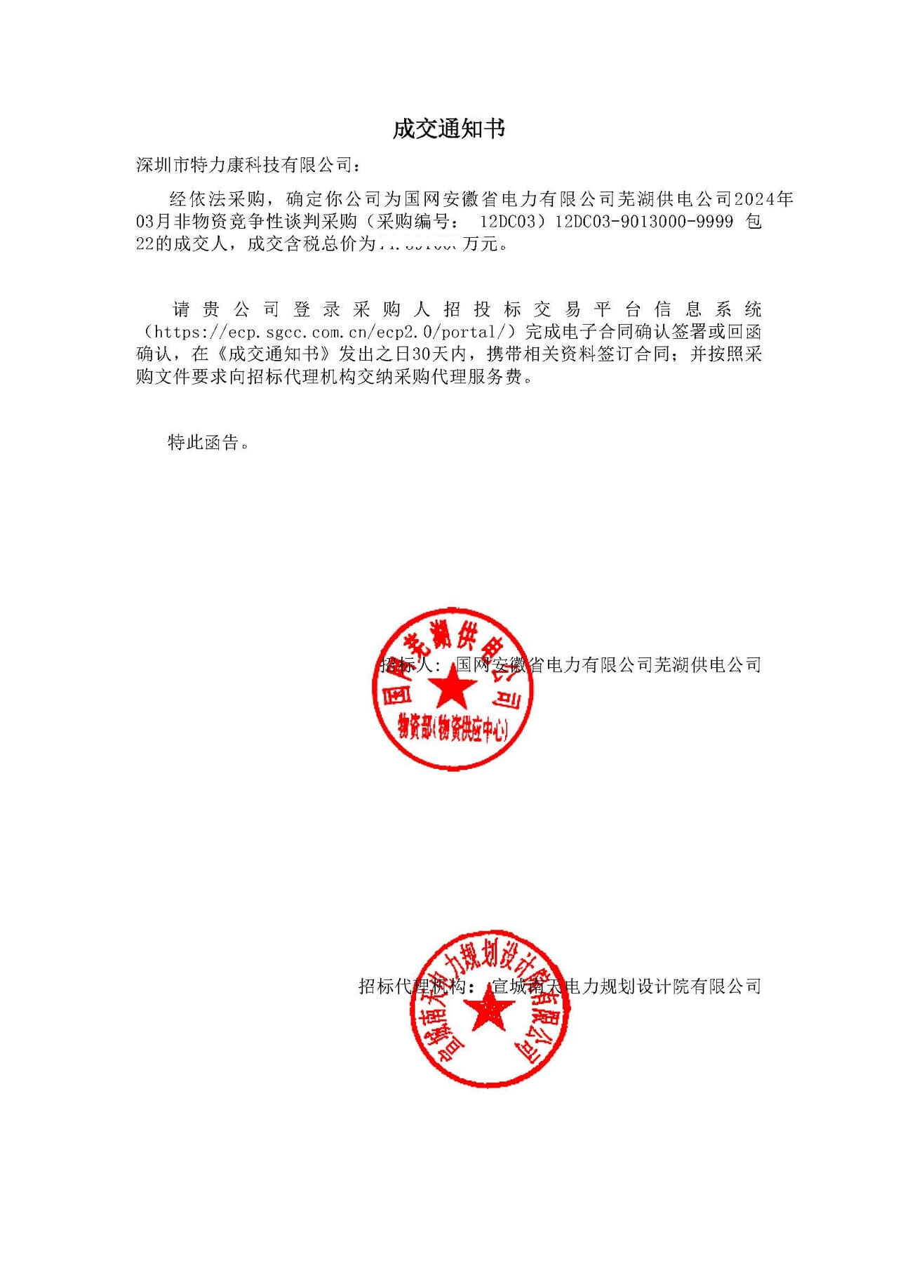 2024年4月1日——深圳市特力康科技有限公司(以下簡(jiǎn)稱“特力康”)近日成功中標(biāo)國(guó)網(wǎng)安徽省電力有限公司蕪湖供電公司2024年3月非物資競(jìng)爭(zhēng)性談判采購(gòu)項(xiàng)目(采購(gòu)編號(hào):12DCO3)中的相關(guān)包件。