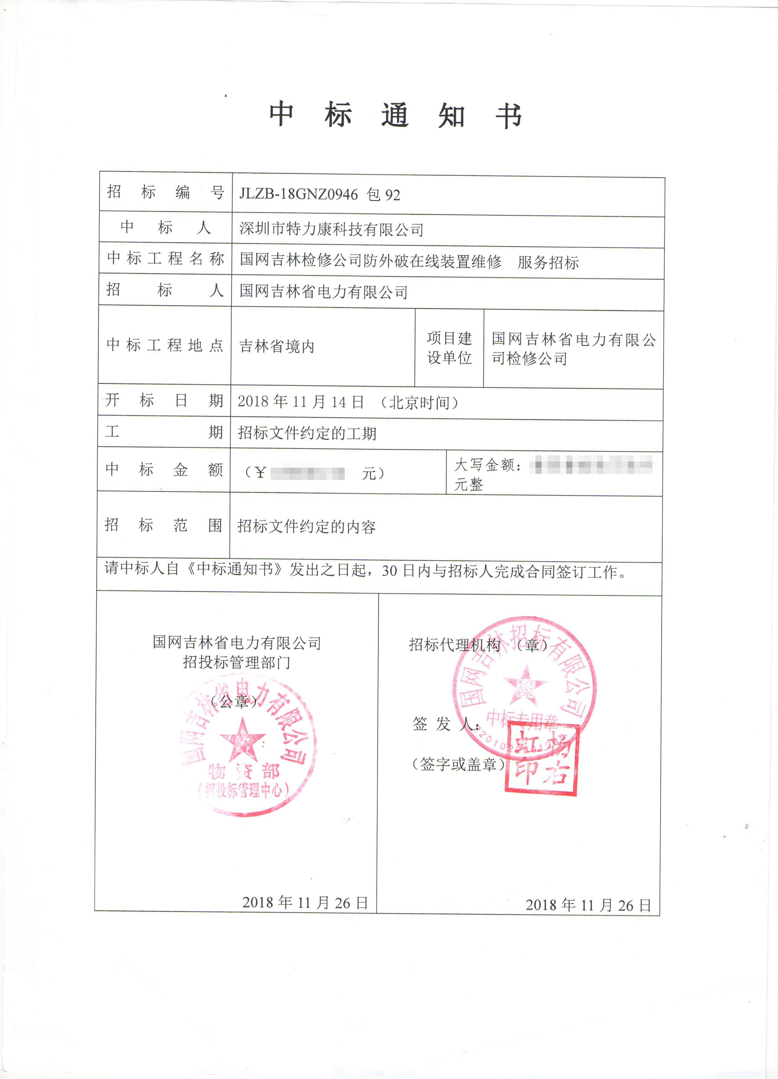 國網(wǎng)吉林省電力公司防外破裝置項(xiàng)目采購項(xiàng)目評審工作已結(jié)束,經(jīng)評審委員會評審,經(jīng)國網(wǎng)吉林省電力公司招投標(biāo)領(lǐng)導(dǎo)小組批準(zhǔn),將評審結(jié)果公示。我司被確定為中標(biāo)單位現(xiàn)將公告公示。
