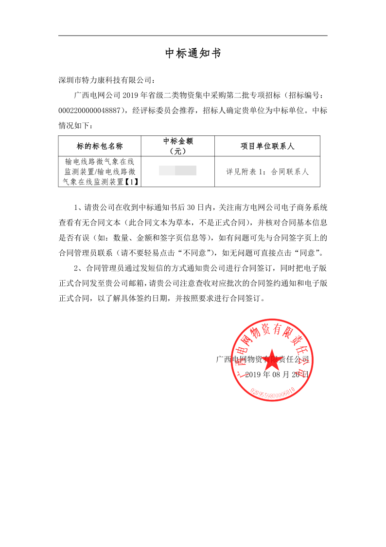 廣西電網(wǎng)公司 2019 年省級二類物資集中采購第二批專項招標(biāo)項目評審工作已結(jié)束,經(jīng)評標(biāo)委員會推薦,招標(biāo)人確定我司為中標(biāo)單位。