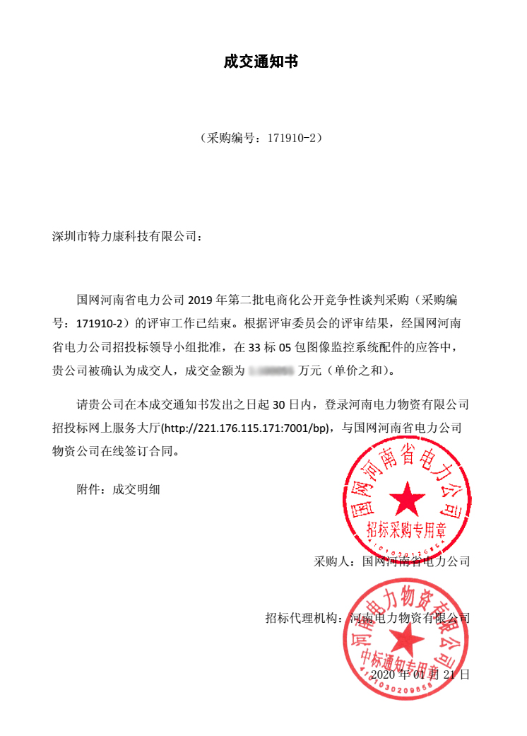 國網(wǎng)河南省電力公司2019年第二批電商化公開競(jìng)爭(zhēng)性談判采購(采購編號(hào): 171910-2) 談判工作已結(jié)束,經(jīng)評(píng)審委員會(huì)評(píng)審,并報(bào)公司招投標(biāo)工作領(lǐng)導(dǎo)小組批準(zhǔn),我司中標(biāo)國網(wǎng)河南省電力公司2019年第二批電商化公開競(jìng)爭(zhēng)性談判采購33標(biāo)05包圖像監(jiān)控系統(tǒng)配件及34標(biāo)03包圖像監(jiān)控系統(tǒng)接口板,中標(biāo)通知如下: