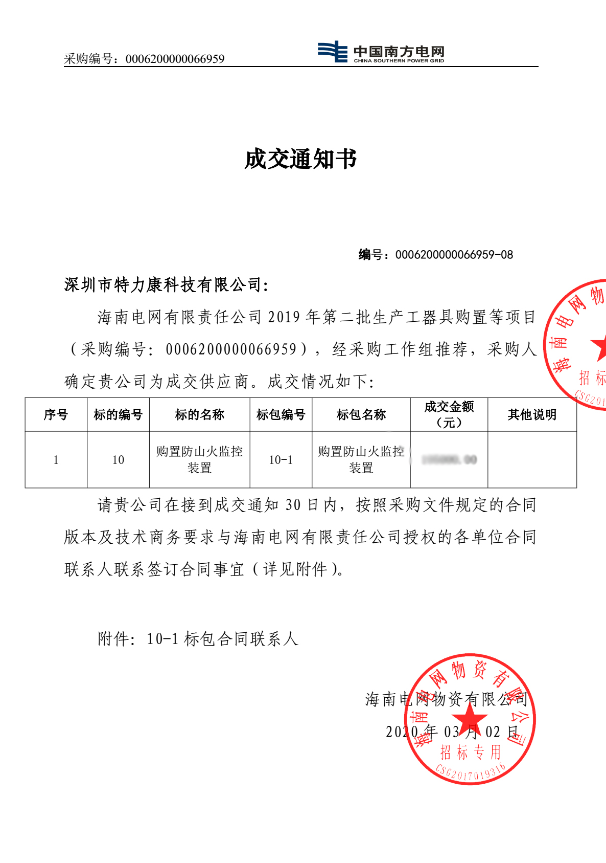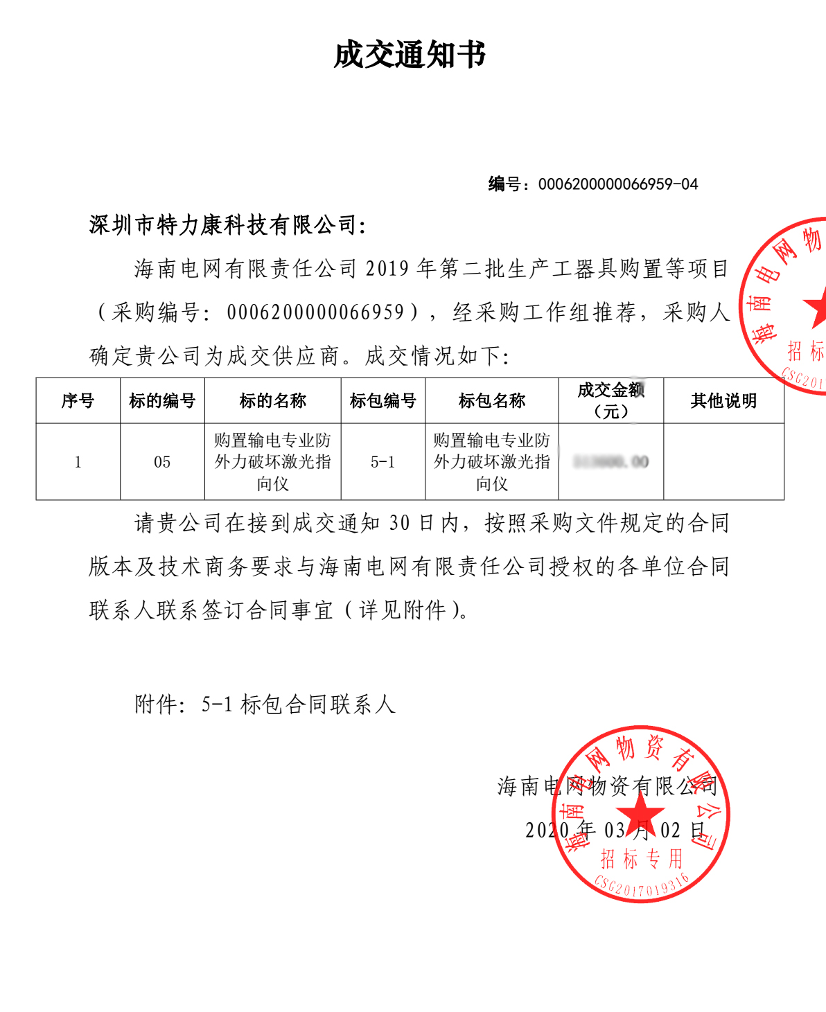 海南電網(wǎng)有限責(zé)任公司2019年第二批生產(chǎn)工器具購(gòu)等項(xiàng)目(采購(gòu)編號(hào); 0000660509 )采購(gòu)工作已完成。經(jīng)采購(gòu)工作組推薦,采購(gòu)人確定我司(深圳市特力康科技有限公司)成為本此標(biāo)包5-1購(gòu)置輸電專業(yè)防外力破壞激光指向儀及標(biāo)包10-1購(gòu)置防山火監(jiān)控裝置的成交供應(yīng)商,附成交通知書(shū)如下: