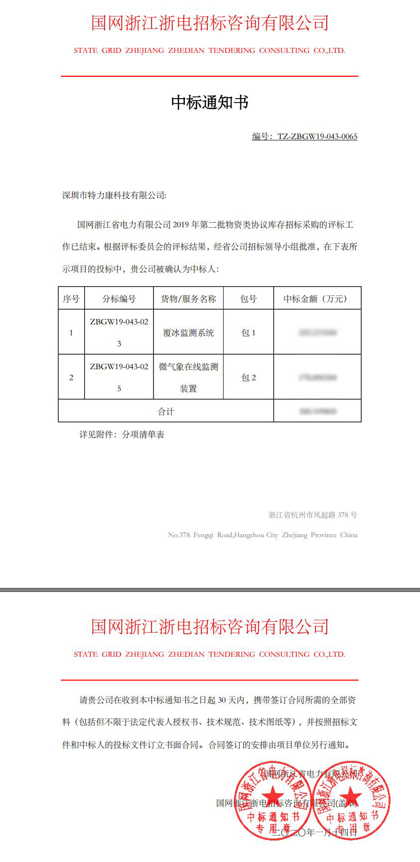 國網(wǎng)浙江省電力有限公司2019年第二批物資類協(xié)議庫存招標采購的評標工作已結(jié)束。根據(jù)評標委員會的評標結(jié)果,經(jīng)省公司招標領(lǐng)導小組批準,我司(深圳市特力康科技有限公司)中標ZBGW19-043-023覆冰監(jiān)測系統(tǒng)包1及ZBGW19-043-025微氣象在線監(jiān)測包2兩個標包,現(xiàn)附中標通知書如下: