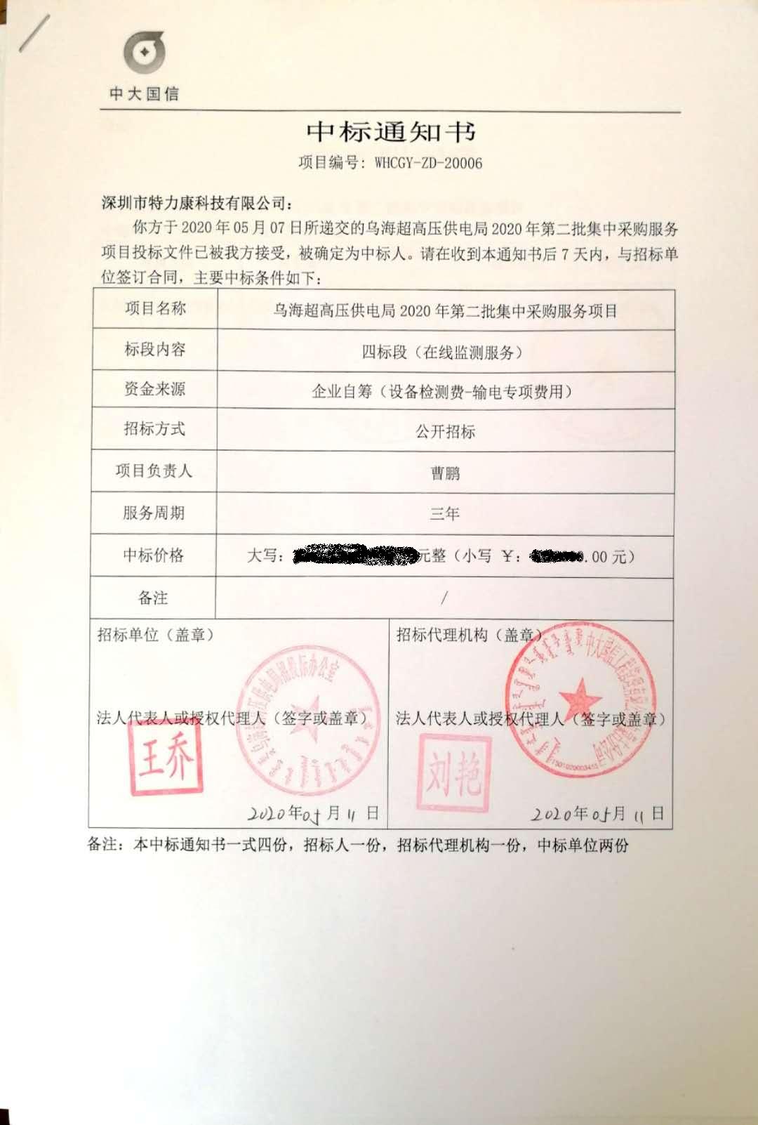經(jīng)招標領(lǐng)導(dǎo)組批準,我司于2020年05月07日所遞交的烏海超高壓供電局2020年第二批集中采購服務(wù)項目(四標段:在線監(jiān)測服務(wù))投標文件已被局方接受,被確定為中標人。特發(fā)中標通知書,如下: