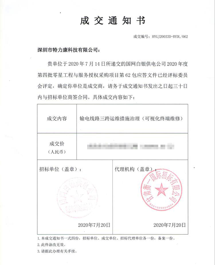 我司于2020年7月14日參加了國網(wǎng)白銀供電公司2020年度第四批零星工程與服務(wù)授權(quán)采購項目第62包輸電線路三跨運(yùn)維措施治理(可視化終端維修)的投標(biāo)工作,所遞交的應(yīng)答文件經(jīng)評標(biāo)委員會評定,確定我司(深圳市特力康科技有限公司)是成交商,具體成交內(nèi)容如下: