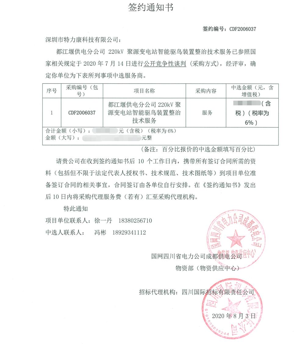 2020年7月14日我司(深圳市特力康科技有限公司)參加的都江堰供電分公司220kV聚源變電站智能驅(qū)鳥裝置整治技術(shù)服務(wù),已參照國家相關(guān)規(guī)定進(jìn)行公開競爭性談判(采購方式),后經(jīng)專家評(píng)審,確定我司為都江堰供電分公司220kV聚源變電站智能驅(qū)鳥裝置整治技術(shù)服務(wù)中選服務(wù)商。特發(fā)簽約通知書如下: