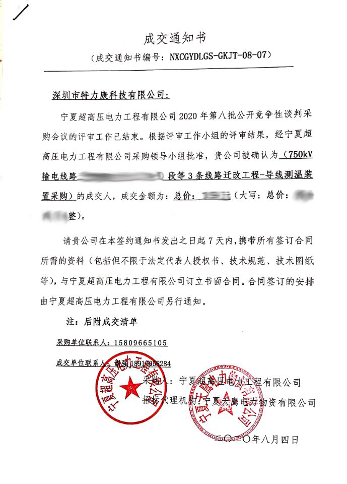寧夏超高壓電力工程有限公司2020年第八批公開競(jìng)爭(zhēng)性談判采購(gòu)會(huì)議的評(píng)審工作已結(jié)束。根據(jù)評(píng)審工作小組的評(píng)審結(jié)果,經(jīng)寧夏超高壓電力工程有限公司采購(gòu)領(lǐng)導(dǎo)小組批準(zhǔn),我司(深圳市特力康科技有限公司)被確認(rèn)為_ (750kV輸電線路中3條線路遷改工程-導(dǎo)線測(cè)溫裝置采購(gòu))的成交人,現(xiàn)發(fā)布成交通知書如下: