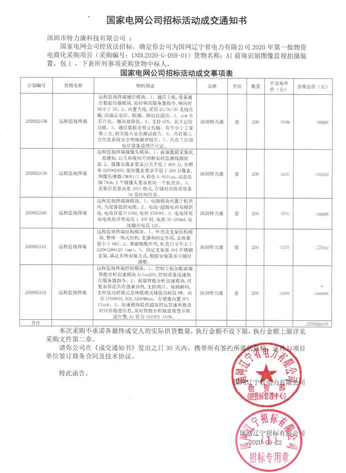 國(guó)家電網(wǎng)公司經(jīng)依法招標(biāo),確定我司(深圳市特力康科技有限公司)為國(guó)網(wǎng)遼寧省電力有限公司2020年第一批物資電商化采購(gòu)項(xiàng)目(采購(gòu)編號(hào): LNDL2020-G- -DSH-01)貨物名稱: AI 前端識(shí)別圖像監(jiān)視拍攝裝置,包1,下表所列事項(xiàng)采購(gòu)貨物中標(biāo)人(附件如下)。