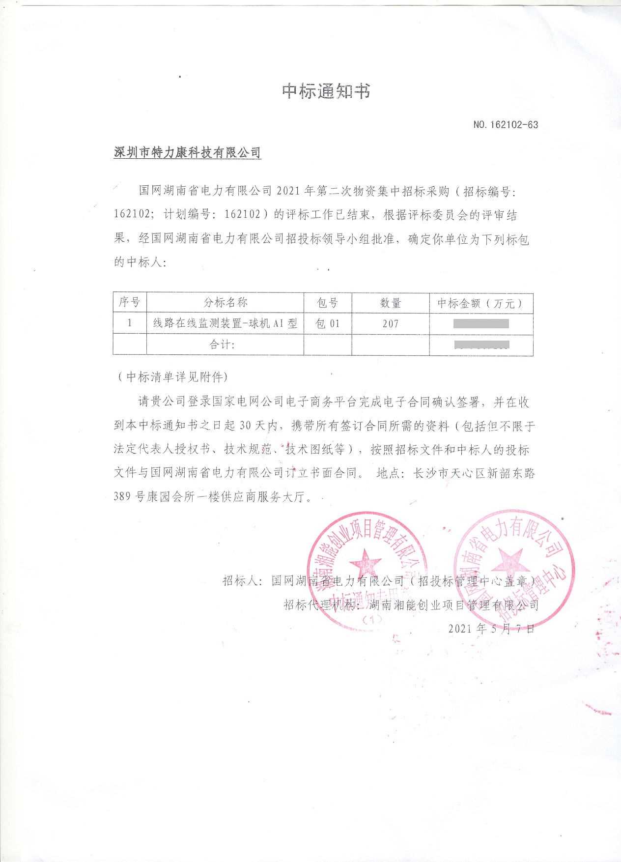 國網(wǎng)湖南省電力有限公司2021年第二次物資集中招標(biāo)采購(招標(biāo)編號(hào):162102;計(jì)劃編號(hào): 162102) 的評標(biāo)工作已結(jié)束,根據(jù)評標(biāo)委員會(huì)的評審結(jié)果,經(jīng)國網(wǎng)湖南省電力有限公司招投標(biāo)領(lǐng)導(dǎo)小組批準(zhǔn),確定我司為線路在線監(jiān)測裝置-球機(jī)AI型標(biāo)包的中標(biāo)人,中標(biāo)通知如下: