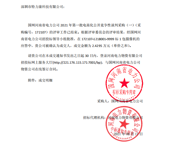 國網河南省電力公司2021年第一批電商化公開競爭性談判采購《- -) (果購編號: 172107) 的評審工作已結束。根據評審委員合的評審結果,經國網河南省電力公司招投標領導小組批準,在7210710101.9999標1包攝像機的應答中,責公司被確認為成交人,中標通知如下: