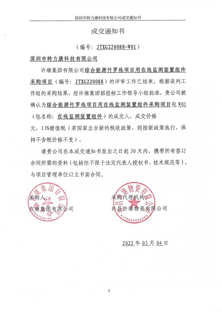 許繼集團(tuán)有限公司綜合能源竹羅線項(xiàng)目用在線監(jiān)測(cè)裝置組件采購(gòu)項(xiàng)且(編號(hào): JTX6220088)的評(píng)審工作已結(jié)束。根據(jù)談判工作組的采購(gòu)結(jié)果,經(jīng)許繼集團(tuán)招投標(biāo)工作領(lǐng)導(dǎo)小組批準(zhǔn),貴公司被確認(rèn)為綜合能源竹羅線項(xiàng)且用在線監(jiān)測(cè)裝置組件采購(gòu)項(xiàng)目包W01(包名稱:在線監(jiān)測(cè)裝置組件)的成交人,成交通知如下:
