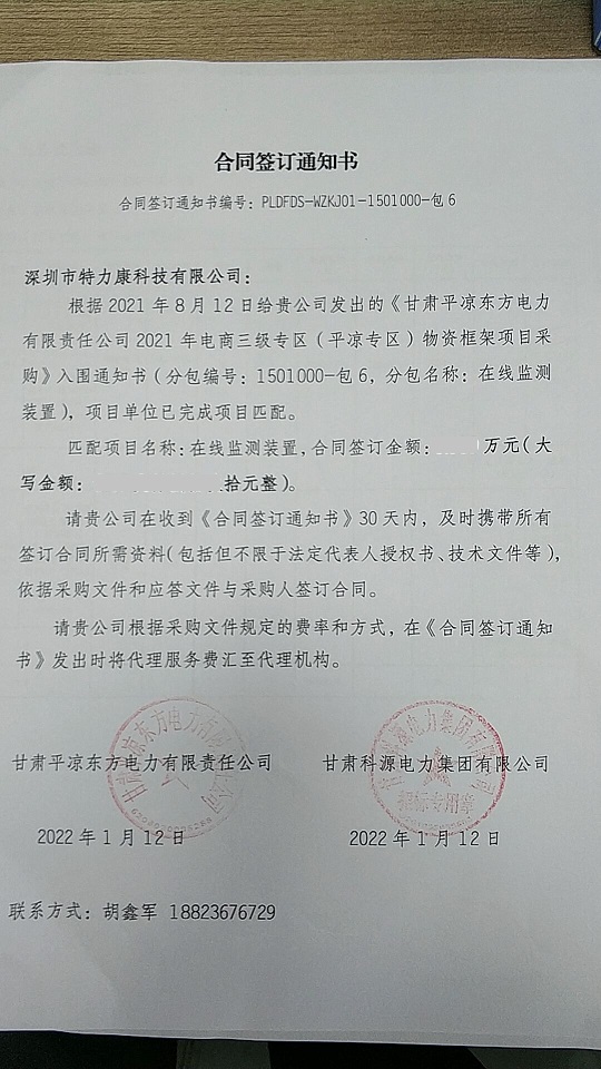 根據(jù)2021年8月12日給貴公司發(fā)出的《甘肅平?jīng)鰱|方電力有限責(zé)任公司2021年電商三級(jí)專(zhuān)區(qū)(平?jīng)鰧?zhuān)區(qū))物資框架項(xiàng)目采購(gòu)》入圍通知書(shū)(分包編號(hào): 1501000-包6, 分包名稱(chēng):在線監(jiān)測(cè)裝置,項(xiàng)目單位已完成項(xiàng)目匹配。成交通知如下: