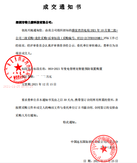 深圳市特力科故有公司:很高興地通知您,由我公司組織招標(biāo)的薛家灣供電局2021年10月第二批-公司二級采購一競價采購-后審標(biāo)段(采期編號: 0722-217fe693nnb)評標(biāo)工作已經(jīng)結(jié)束,經(jīng)評審委員會認真評審?fù)扑]并經(jīng)公承,委托單位審核確認。貴單位為該項日成交人。標(biāo)段名稱: 003-2021年變電管理處智能預(yù)防裝置購置,成交通知如下: