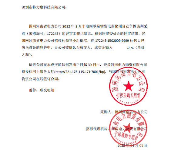 國(guó)網(wǎng)河南省電力公司2022年3月非電網(wǎng)零星物資電商化項(xiàng)目競(jìng)爭(zhēng)性談判采購(gòu)(采購(gòu)編號(hào): 172245)的評(píng)審工作已結(jié)束。根據(jù)評(píng)審委員會(huì)的評(píng)審結(jié)果,經(jīng)國(guó)網(wǎng)河南省電力公司招投標(biāo)領(lǐng)導(dǎo)小組批準(zhǔn),在172245-1502009-9999標(biāo)包1包防鳥設(shè)備的應(yīng)答中,我司被確認(rèn)為成交人,成交通知如下: